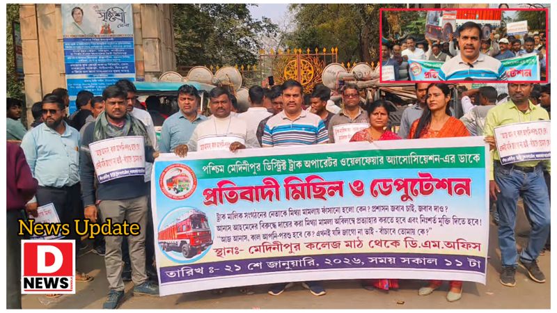 ফের আন্দোলনে নামলেন পশ্চিম মেদিনীপুরের ট্রাক মালিক এবং ড্রাইভাররা। এদিন তারা কলেজ মাঠ থেকে একটি বিক্ষোভ মিছিল করে জেলা শাসকের দপ্তরের সামনে বিক্ষোভ দেখান। সেই সঙ্গে তুলে দেন একটি ডেপুটেশন।নেতৃত্ব জানান অবিলম্বে মিথ্যে মামলায় গ্রেপ্তার হওয়া তাদের সংগঠনের নেতা কে নিঃশর্তে মুক্তি দিতে হবে,সেই সঙ্গে সমস্ত মামলা প্রত্যাহার করতে হবে প্রশাসনকে না হলে বৃহত্তর আন্দোলনে নামা হবে।
