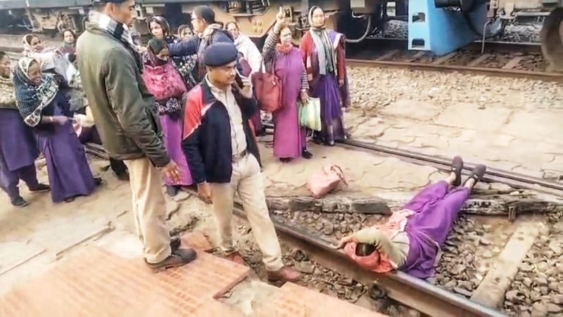 Midnapore:পুলিশি বাধা পেয়ে রেল লাইনে শুয়ে বিক্ষোভ আশা কর্মীদের!ক্ষুব্ধ হয়ে মন্তব্য”আমরা মুখ্যমন্ত্রীর শত্রু না”