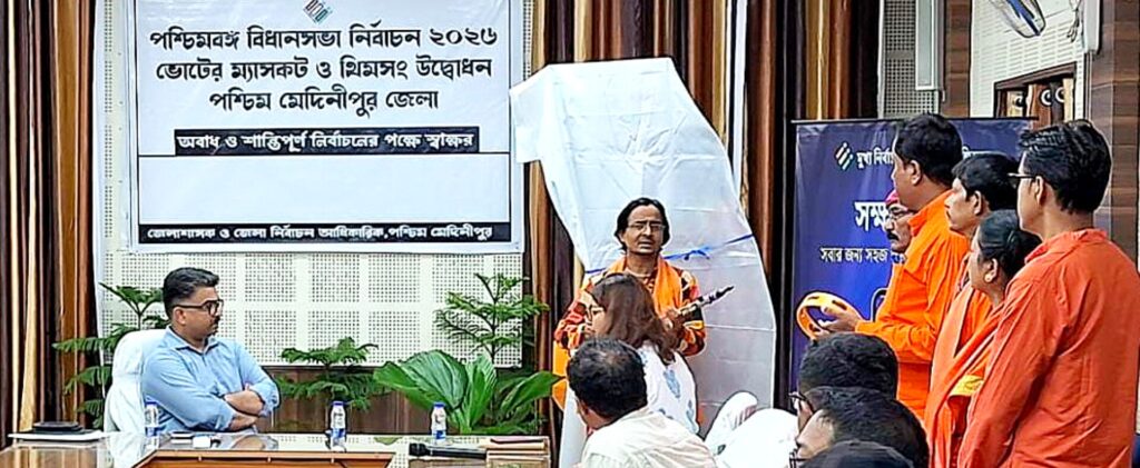 বিধানসভা নির্বাচন ২০২৬ উপলক্ষে পশ্চিম মেদিনীপুর জেলার ইলেকশন ম্যাসকট ও থিম সং উদ্বোধন করলেন জেলা শাসক ও জেলা নির্বাচন আধিকারিক,পশ্চিম মেদিনীপুর। পশ্চিম মেদিনীপুর জেলার এবারের ইলেকশন ম্যাসকট হিসেবে আত্মপ্রকাশ করেছে “চিত্রা”।এই ম্যাসকটের মাধ্যমে একদিকে যেমন নারী-ক্ষমতায়নের বার্তা তুলে ধরা হয়েছে, তেমনই পশ্চিম মেদিনীপুর জেলার ঐতিহ্যবাহী পটচিত্র শিল্পেরও সুন্দর উপস্থাপন ঘটেছে। এবার পশ্চিম মেদিনীপুর জেলার ইলেকশন আইকন হয়েছেন ইংলিশ চ্যানেল জয়ী আফরিন জাবি। তিনি নতুন ভোটারদের ভোট দানের ব্যাপারে উত্সাহিত করেন। এই অনুষ্ঠানের অংশ হিসেবে একটি থিম সং প্রকাশ করা হয়, যার মূল উদ্দেশ্য অবাধ, শান্তিপূর্ণ ও অংশগ্রহণমূলক নির্বাচনের গুরুত্ব তুলে ধরা। গানটির মাধ্যমে জেলার সর্বস্তরের মানুষের কাছে ইতিবাচক ও দায়িত্বশীল ভোটদানের আহ্বান জানানো হয়েছে।